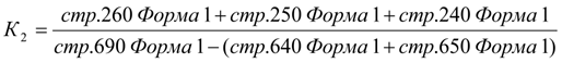 Промежуточный коэффициент покрытия К2 характеризует способность предприятия оперативно высвободить из хозяйственного оборота денежные средства и погасить долговые обязательства. К2 определяется как :